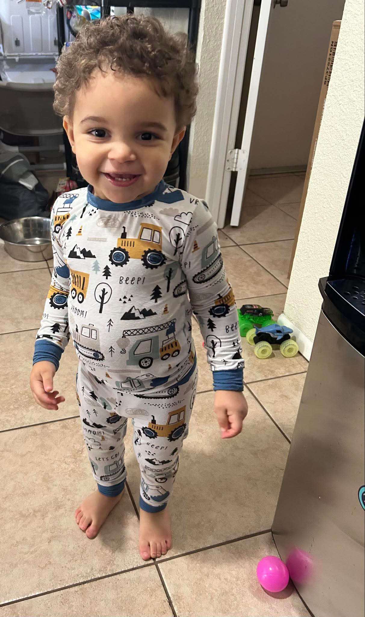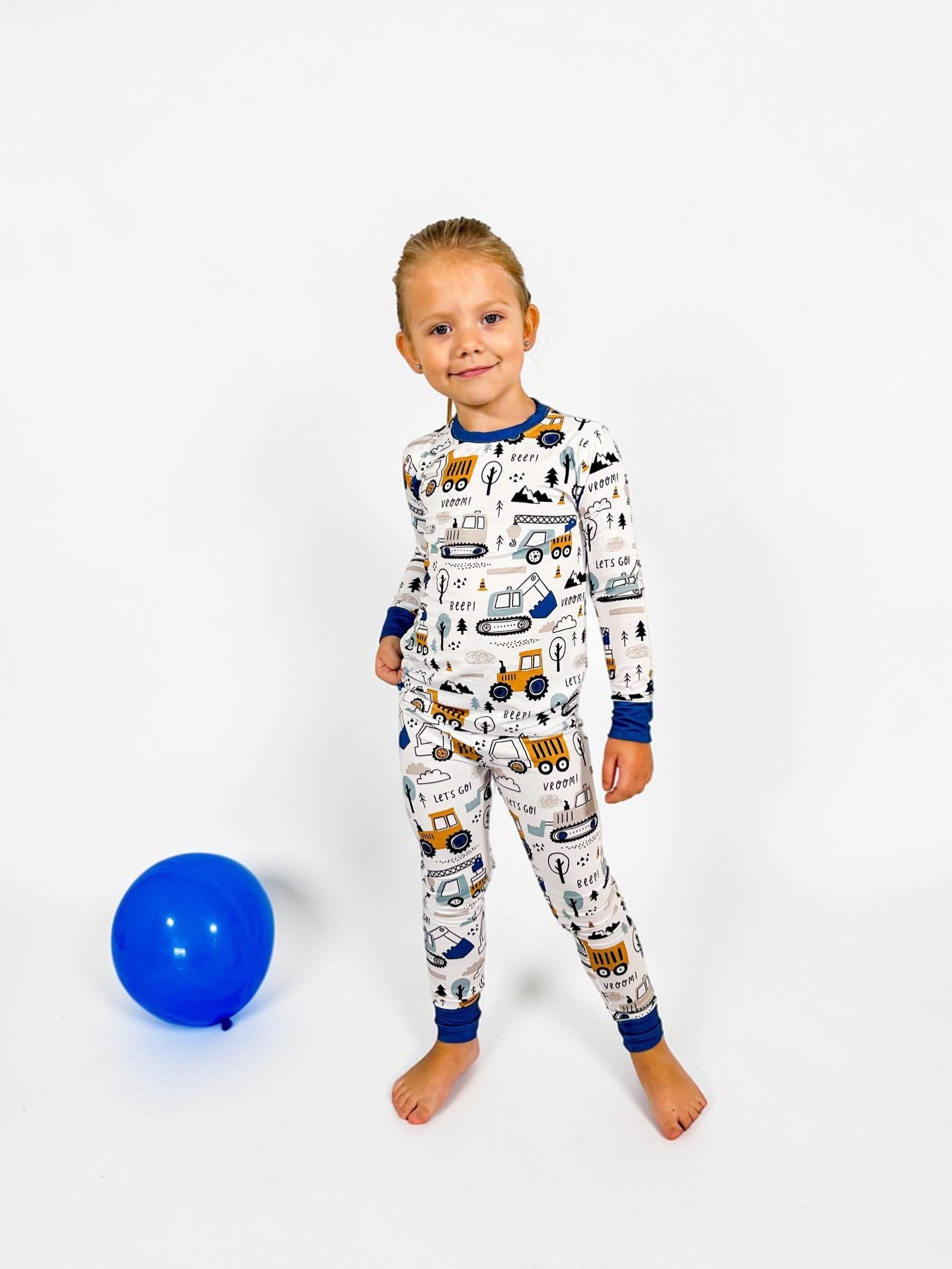 Our Construction Zone two-piece bamboo pajamas are built for little builders who love trucks, diggers, and all things that go vroom, featuring a playful mix of construction vehicles, cranes, dump trucks, and fun on-the-go details set against a soft neutral backdrop. Accented with cool blue cuffs for a classic finish, this construction-themed pajama set is perfect for kids who are fascinated by job sites, big machines, and hands-on adventures, bringing an energetic yet cozy feel to bedtime and early morning play.