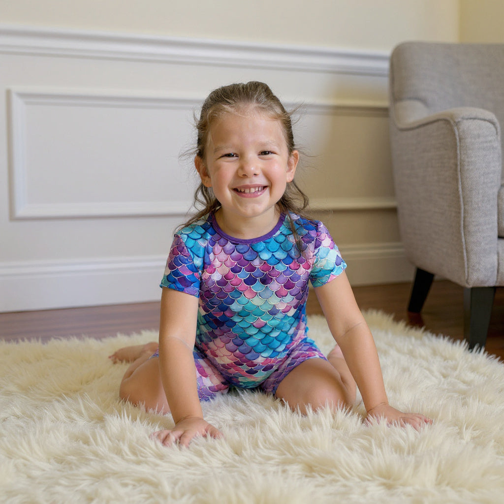 Our Mermazing Purple two-piece bamboo pajamas shimmer with beautiful mermaid scale patterns in dreamy shades of purple, teal, and soft aqua, creating a magical under-the-sea inspired look. The iridescent-style design and rich purple trim give this mermaid-themed pajama set a whimsical, ocean-inspired feel that little mermaid lovers will adore. Bold, enchanting, and full of fantasy charm, Mermazing Purple brings a splash of sparkle and imaginative magic to bedtime and cozy mornings.