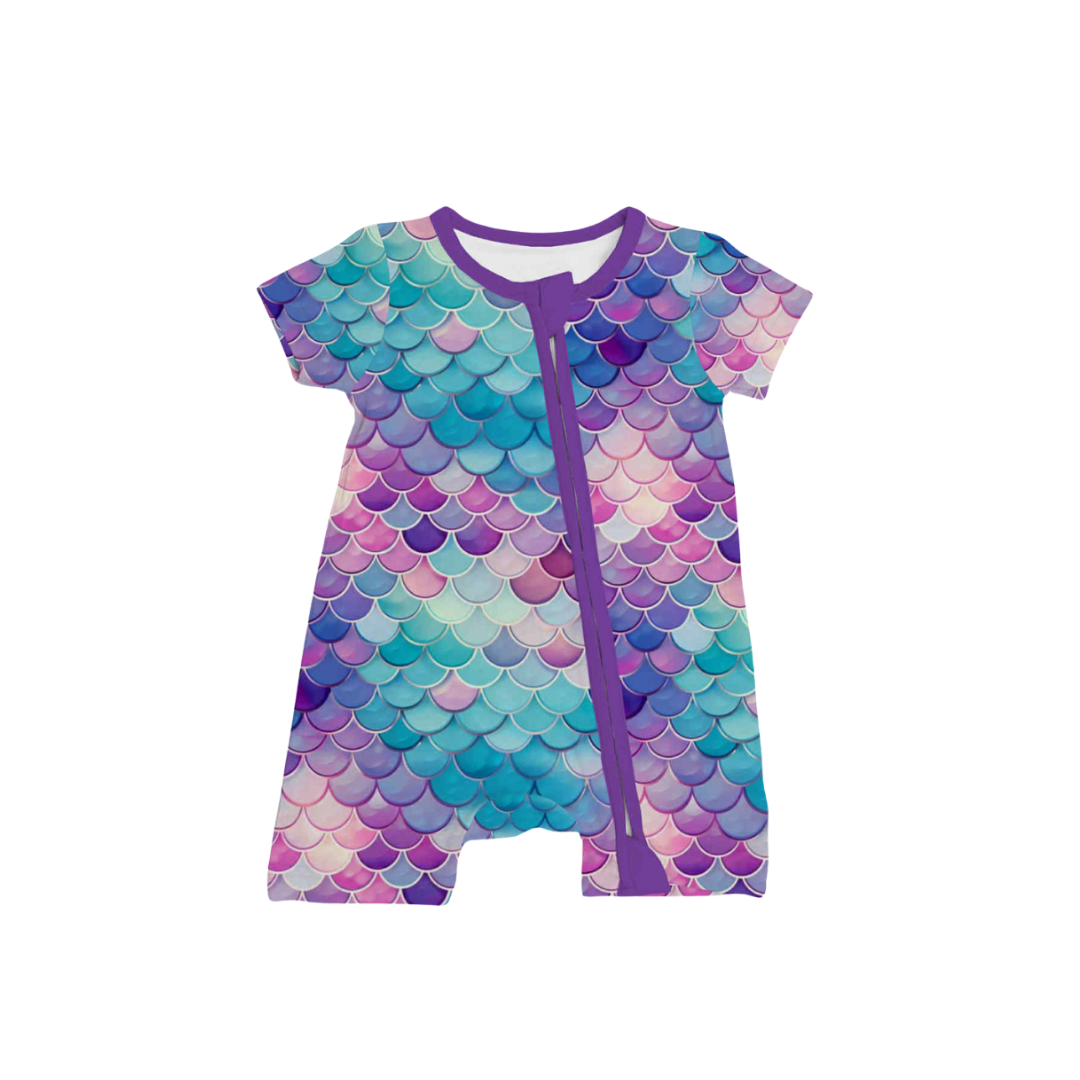 Our Mermazing Purple bamboo sleeper features beautiful mermaid scale patterns in dreamy shades of purple, blue, and teal. With a two-way zipper for easy diaper changes and fold-over feet and cuffs, it’s designed for both comfort and convenience. The buttery-soft bamboo fabric keeps little mermaids cozy all night long.