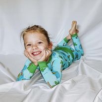 Our Surfasaurus two-piece bamboo pajamas feature a laid-back dinosaur catching waves beneath swaying palm trees, set against a soft ocean-blue background. This playful surf-themed pajama set blends prehistoric fun with tropical vibes, making it perfect for little adventurers who dream of sunny beaches and big waves. Finished with fresh green cuffs that tie the look together, Surfasaurus brings a splash of island-inspired charm to bedtime and morning play.