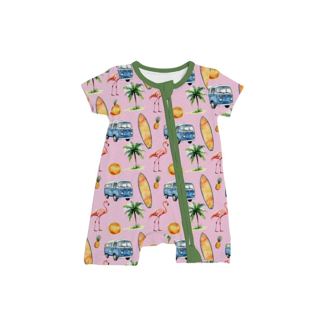 Our Tropic Like It’s Hot bamboo sleeper brings bright tropical fun with flamingos, sunshine, and playful summer vibes. Designed with a two-way zipper for quick diaper changes, it also features fold-over feet and cuffs for comfort and warmth. The breathable bamboo fabric keeps little ones cozy while they dream of sunny adventures.